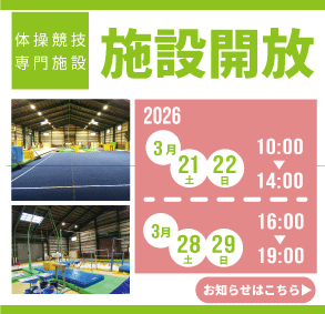 体操競技愛好家に、体操競技専門施設「よっしゃ!」を一般開放しています。