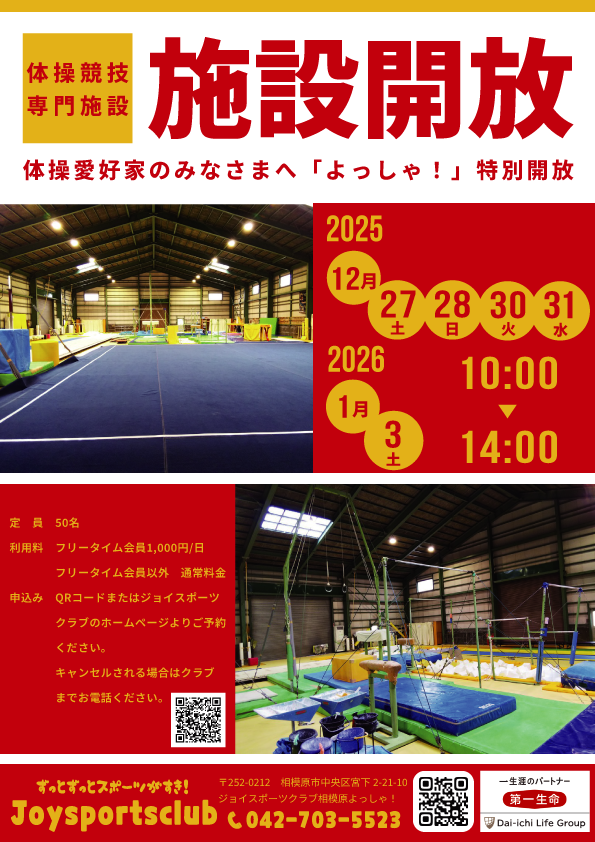 【日程追加】よっしゃ!特別開放のお知らせ 2025.12.11 よっしゃ!特別開放のお知らせです。体操愛好家の皆様、是非ご利用ください!期 間 令和7年12月23・27・28・30・31日・令和8年1月3日時 間 10:00~14:00 定 員 50名利用料 フリータイム会員・・・1,000円(1日あたり) フリータイム会員以外・・・通常料金よっしゃ!特別開放ご予約はこちらから♪