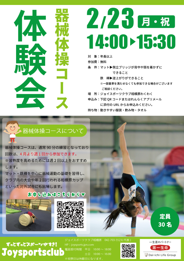 ジョイスポーツクラブ相模原では、2月23日(月・祝)に、器械体操コースの体験会を開催いたします。
